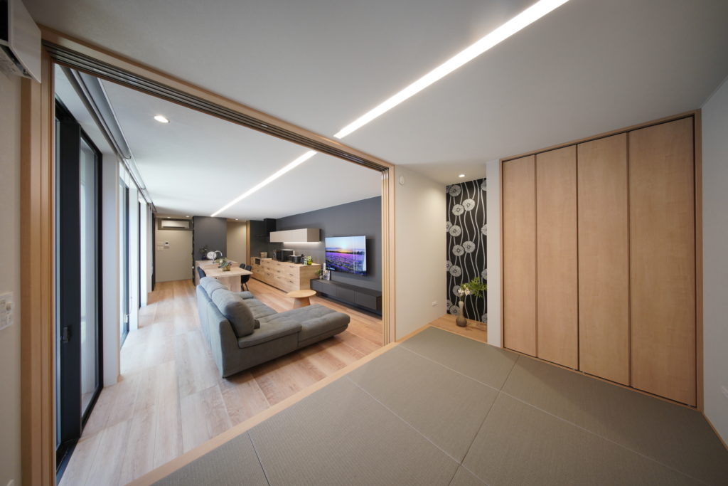 南側一面をキッチンから和室までつながる一続きの空間にし、南面全体に窓を設け、